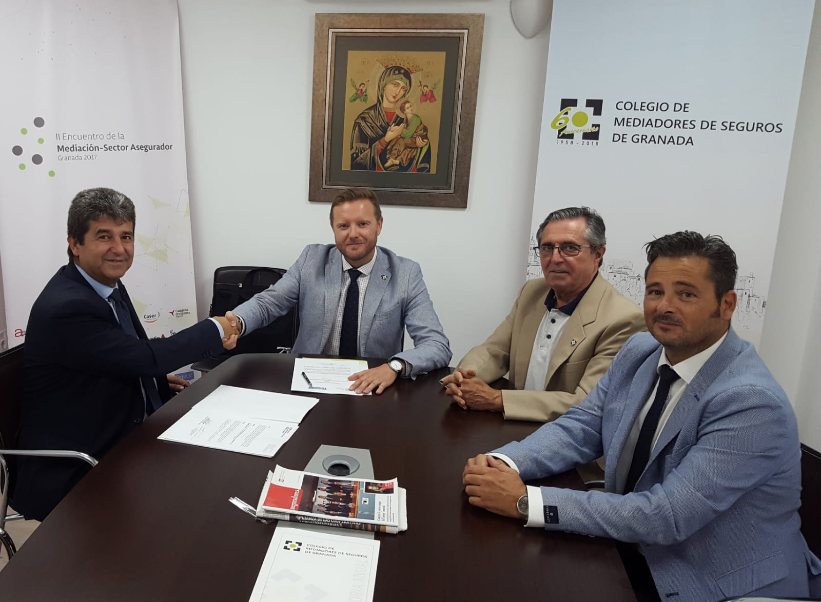 La firma del acuerdo, celebrada en la sede colegial, tuvo la participación de Genaro Sánchez, Presidente del Colegio de Mediadores de Seguros de Granada; Antonio Muñoz Herrainz, Director Territorial Sur de Pelayo; así como de Enrique J. Pérez, vicepresidente del Colegio; Miguel Ángel Urbano, responsable Territorial Sur de Pelayo; y Juan Carlos de la Torre, Gerente Canal de Corredores de Granada y Almería.