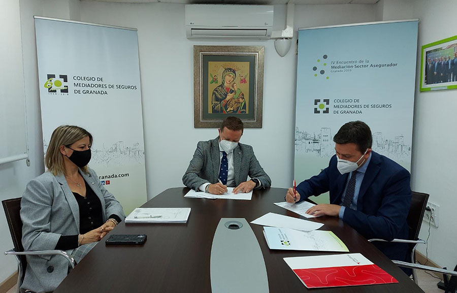 La firma del convenio, que tuvo lugar en las instalaciones de la institución, contó con la presencia del director de la sucursal de Granada de Plus Ultra Seguros, Raúl Molina, del presidente del Colegio de Mediadores de Seguros de Granada, Genaro Sánchez y de la vicepresidenta del Colegio, Laura Molero.